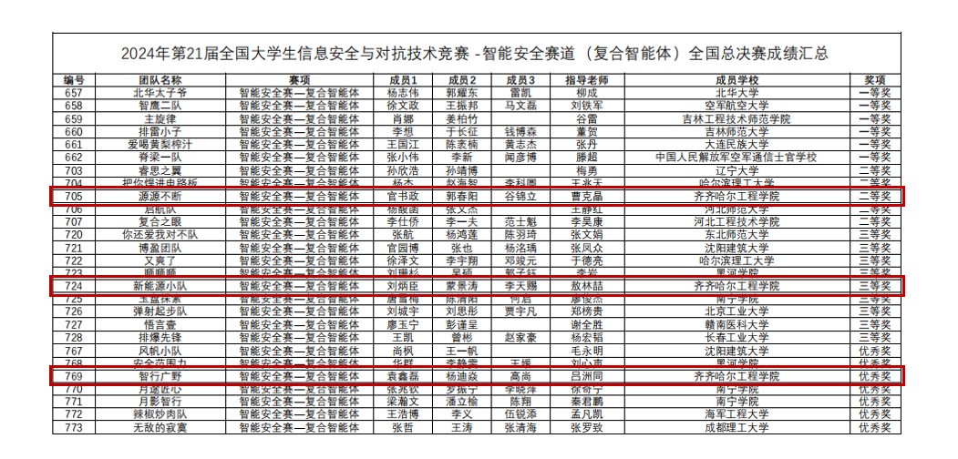 近日,2024年第21届大学生信息安全与对抗技术竞赛传来喜讯,我校机电工程系新能源汽车工程专业学生官书政、郭春阳、谷锦立在智能安全赛-复合智能体赛项获得二等奖;刘炳臣、蒙景涛、李天赐获得三等奖;车辆工程专业学生袁鑫磊、杨迪焱、高尚获得优秀奖(项目以东北区域赛一、二等奖成绩入围)。