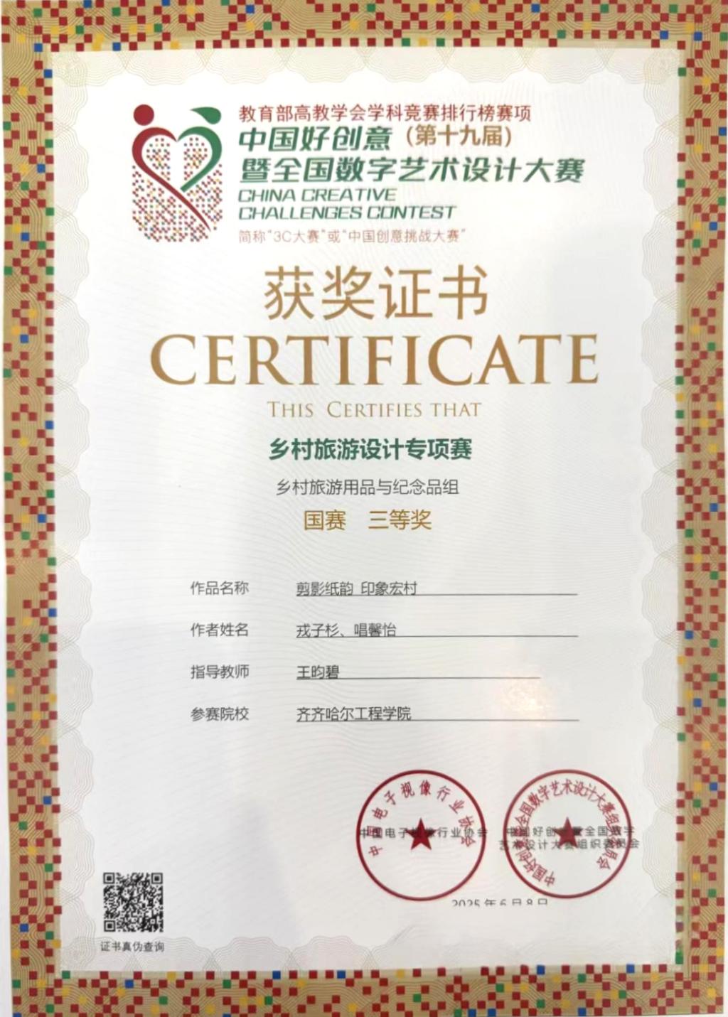 近日,由中国好创意暨全国数字艺术设计大赛组委会主办、武汉商学院承办的第十九届中国好创意暨全国数字艺术设计大赛乡村旅游专项赛颁奖典礼在武汉商学院举行,我校宝贝把腿开大让我添添你视频视觉传达设计专业教师王昀碧指导的232班学生戎子杉、唱馨怡的参赛作品《剪影纸韵、印象宏村》在乡村旅游设计专项大赛中荣获国赛三等奖,戎子杉作为获奖代表受邀参加颁奖典礼。