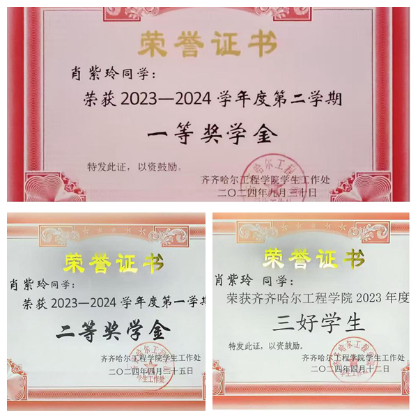 肖紫玲勇于挑战自我,积极参加各类竞赛,在第十届全国应用型人才综合技能大赛获一等奖、“建行杯”中国国际大学生创新创业大赛(2024)获铜奖 、中国创新方法大赛获二等奖。