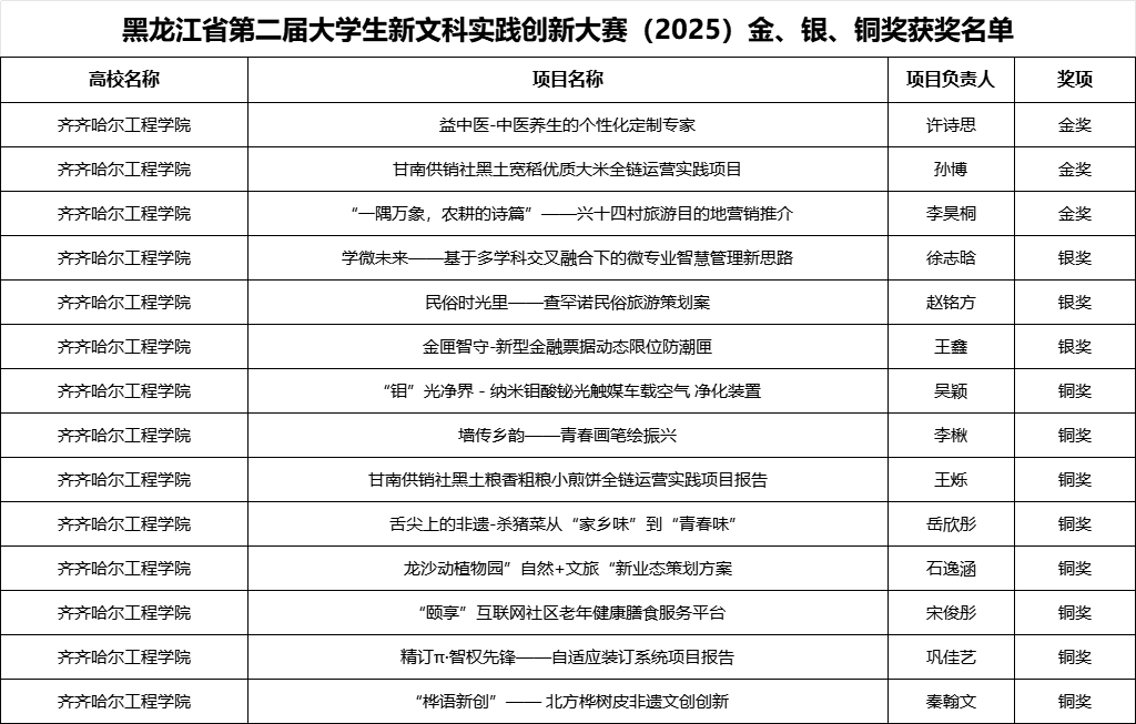 近日,黑龙江省第二届大学生新文科实践创新大赛传来喜讯!我校参赛团队一举斩获省级奖项14项,包括金奖3项、银奖3项、铜奖8项。金奖获奖率较去年提升200%,实现获奖数量与质量双突破,充分彰显我校人才培养的扎实成效。