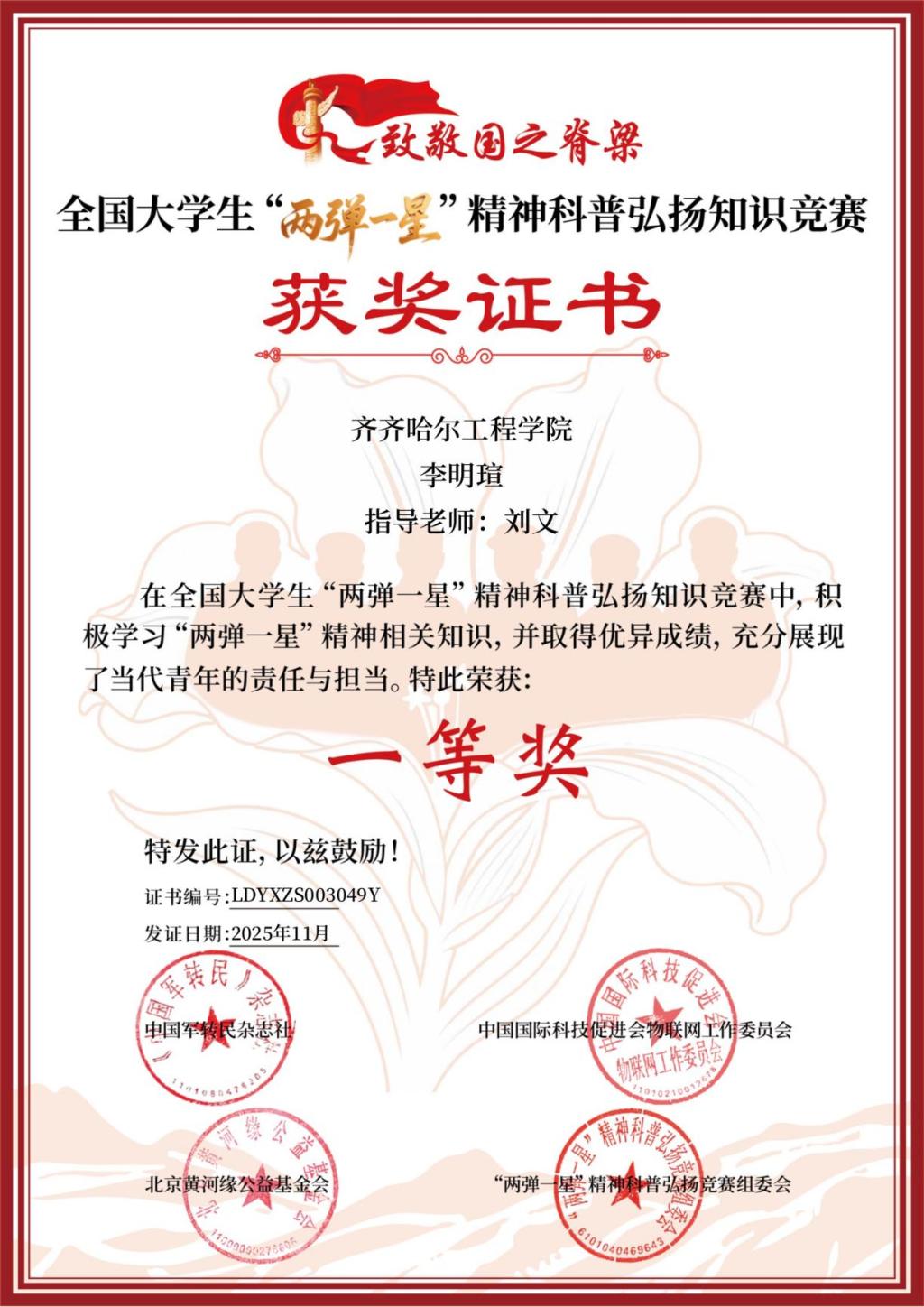竞赛以“传承红色基因、弘扬科学精神、勇担时代使命”为宗旨,与课程思政育人理念高度契合。物理教研室将赛事作为深化思政教育的重要载体,赛前组织学生解读“两弹一星”研制历程中的关键物理原理、技术突破等科普知识,深入宣讲钱学森、邓稼先等老一辈科学家以身许国的爱国事迹,系统阐释“热爱祖国、无私奉献,自力更生、艰苦奋斗,大力协同、勇于登攀”的精神内核。比赛中,我校学子凭借扎实的知识储备和深厚的爱国情怀,经过激烈角逐,最终取得佳绩。