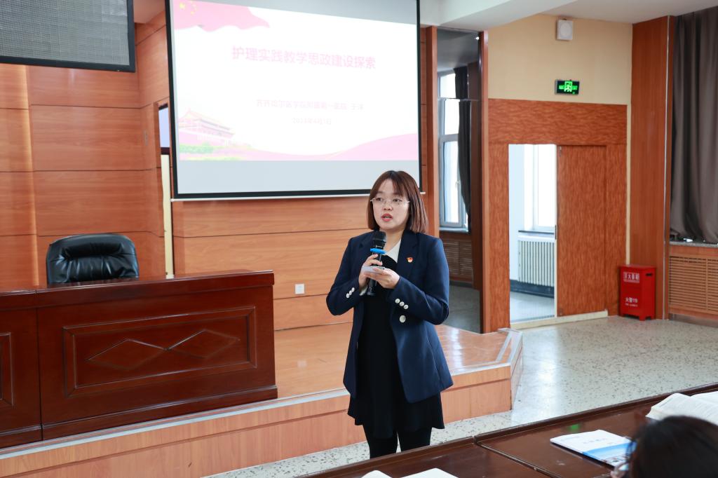 于洋代表首先以人大代表身份向与会人员讲解两会会议精神,结合自己的参会感悟传达了习近平总书记在参加江苏代表团讨论时的重要讲话精神,并对在全国人大会议期间自己提交的4项议案、8个建议进行说明。对提高思想认识领会纲领精神、加强护理实践教学思政建设、创新护理实践思政教学模式三个方面进行详细讲解,报告讲述新冠肺炎期间,黑龙江省援鄂医疗队的典型事迹,以及西安交大前任校长王树国的“家国情怀”。于洋表示,在教学中,教师要挖掘课程所蕴含的思政元素,有机融入临床实践教学。