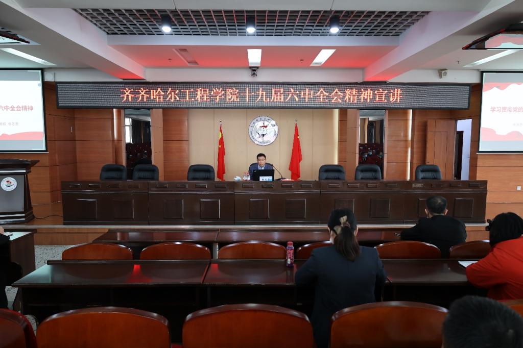 按照省委教育工委和市委相关要求,根据校党委的工作部署,4月23日,我校召开十九届六中全会精神宣讲会。依据防疫要求,全体干部在图书馆601报告厅参会,骨干学习班其他成员、全校其他教工党员、全体学生党员线上参会。