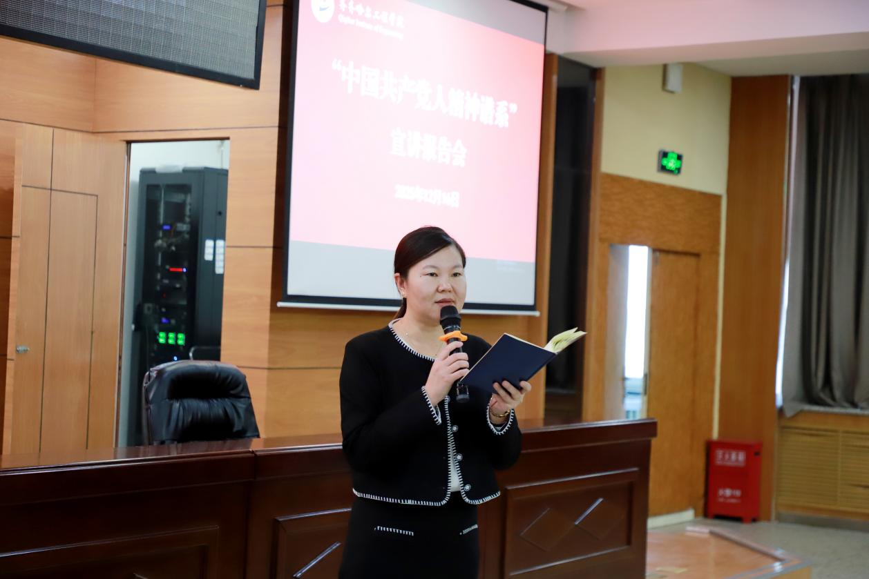 为深入学习贯彻党的二十届四中全会精神,弘扬光荣传统,赓续红色血脉,12月16日下午,学校在图书馆601报告厅举行“中国共产党人精神谱系”宣讲报告会。学校党委委员、党委宣传统战部部长张苗主持会议。各二级党组织书记、副书记,各基层党支部书记,马克思主义学院全体教师以及来自四个学院的学生代表共同聆听报告。