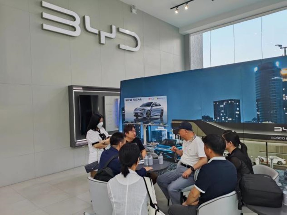1月8日上午,考察团先后来到比亚迪汽车、哪吒汽车直营店,了解汽车生产与销售情况。每到一处,曹勇安理事长都详细询问企业市场规模、技术创新、人才需求、本土化发展等情况。企业代表高度赞赏学校产教融合课程所取得的成绩,希望双方后续以课程建设推动校企更紧密合作、人才高质量发展。