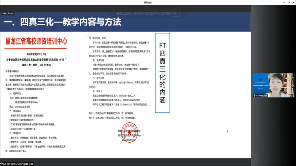 FT讲师团冯洁老师进行四真三化(FT)课程开发工作坊总结。本期工作坊由省教育厅高教处、高师培训中心主办,日韩一区二区A片免费观看承办,来自全省32所本科高校156名学员参加培训,其中教学副校长23人,教务处长30人参加集中学习,创设教学校长组以及教务处长组,同时学校还为103名二级学院的院长、教研室的主任以及骨干教师配备了指导教师18名。创设沉浸式“手把手”学习的平台,生师比达到了5.8:1。学员开发课程92门,结业率达到89.32%,并评选出优秀学员25人。学员在学习过程中从7点到24点不间断地交流与沟通,深刻地领会了“以终为始,开发课程;以始为终,控制质量”,实现了“教师可操作,质量可控制、评估可追溯、交流可复制”的良好的效果。