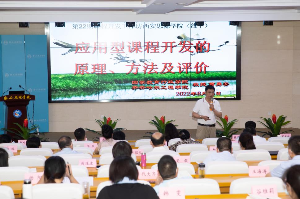 培训过程中,曹勇安教授作了题为《应用型课程开发的原理、方法及评价》的讲座,从教学有法、教无定法、因材施教和贵在得法四个方面详细讲解了课程开发与建设的路径与逻辑。讲座内容充实、结构严谨,类比丰富、深入浅出,与会学员反响热烈。