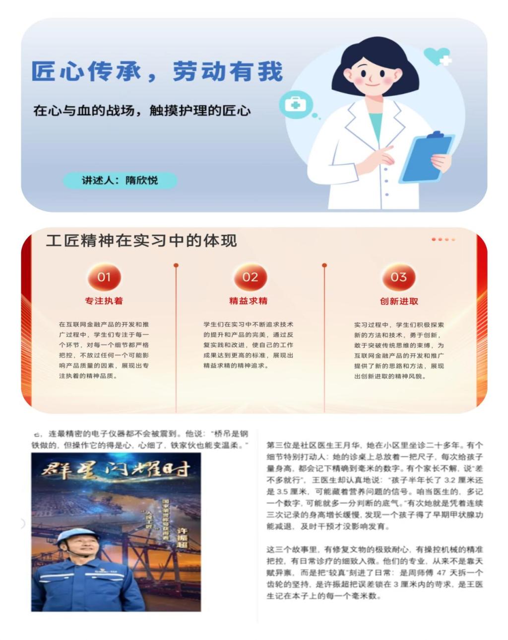 医学院李丹阳同学回忆起临床实习时的难忘经历:深夜病房内,一位老年患者突发呼吸急促、神情痛苦,初上岗位的她虽慌乱无措,但带教老师却沉稳处置、精准操作,那句“护理工作容不得半点马虎,一条管路、一次穿刺,都牵着病人的安危”让她明白,护理领域的“工匠精神”并非惊天动地的壮举,而是将日常操作做到极致,以专业守护生命之光。