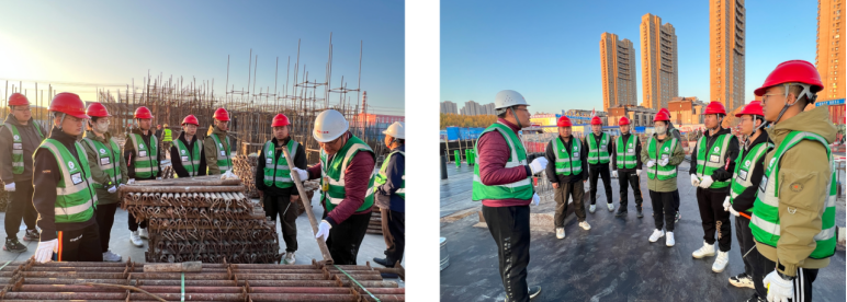 在施工现场中,理事长曹勇安的到来受到建筑工程系师生的热烈欢迎,理事长对学生们悉心教导并强调学校“旺工淡学”教学特色,向同学们再次强调现在在学校的学习方式与明天在社会上的生存方式应保持一致,希望同学们应该借助此次校外课堂实践机会,充分锻炼自己的实践技能,丰富简历的实习经历,提高自身在建筑行业中的竞争优势。