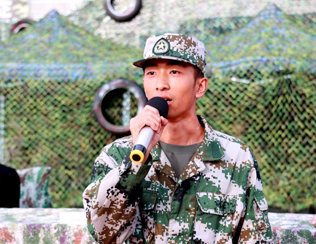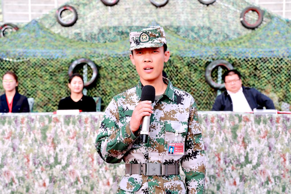 军训标兵代表、信息工程系计科专升本231班全广柱发言,他回顾军训生活的丰富经历,分享个人成长感受与体会,认为军训是融入学校环境,联结同学,考验意志的重要方式,通过军训生活,真正感受到了学校营造的奋发向上的氛围。