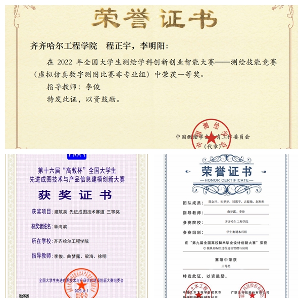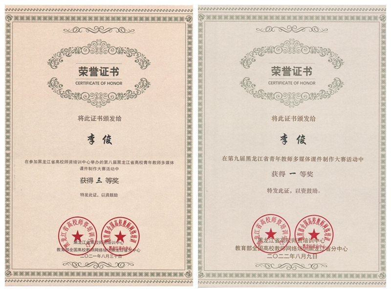 李俊老师在2021年,荣获第八届黑龙江省高校青年教师多媒体课件制作大赛三等奖;2022年荣获第九届黑龙江省高校青年教师多媒体课件制作大赛一等奖;2022年荣获第六届黑龙江省高校青年教师教学竞赛二等奖;第二届黑龙江省高校教师教学创新大赛三等奖;参与的基于FT课程建设理念的《土木工程材料》课程“三四三”教学模式构建与实践》荣获黑龙江省教学成果二等奖;