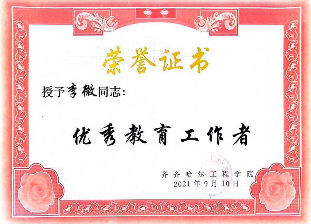 她作为生涯导师,积极鼓励学生参与科研实践,培养创新思维,多次指导学生参与创新训练计划。通过比赛能够使专业知识和各项技能有所提升,在备赛过程中,尽可能地为学生提供帮助和指导。她所指导的学生多次在创新创业、学科竞赛和兴趣爱好比赛中荣获荣誉,同时,李微也多次获得优秀指导教师称号。其中工管211班章海滨获得全国2023年数字建筑创新应用大赛团队三等奖。
