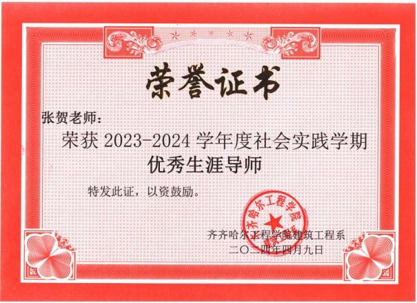 专心执教,初战告捷。作为年轻的教师,张贺虽然入职时间不长,但因其勤奋努力,工作认真,深得学校同行好评。在2023年9月的学校育人质量奖评选中,张贺老师荣获土木工程专业第二名;2024年4月,在学校育人质量奖评选中荣获土木工程专业第一名。同年4月,被评为建筑工程系2023-2024学年度社会实践学期优秀生涯导师。她与其生涯学生的案例故事《新导师“心”生涯》在学校2023年度案例交流评比中荣获校级三等奖。
