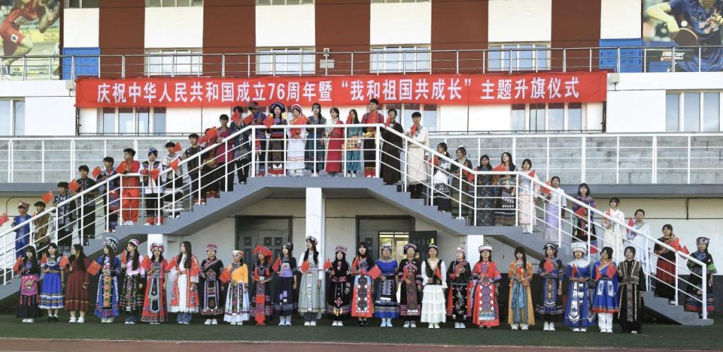 56名学子身着绚丽民族华服排列成“76”字样,以青春之姿礼赞祖国,诠释了中华民族共同体意识与炽热的爱国热情。