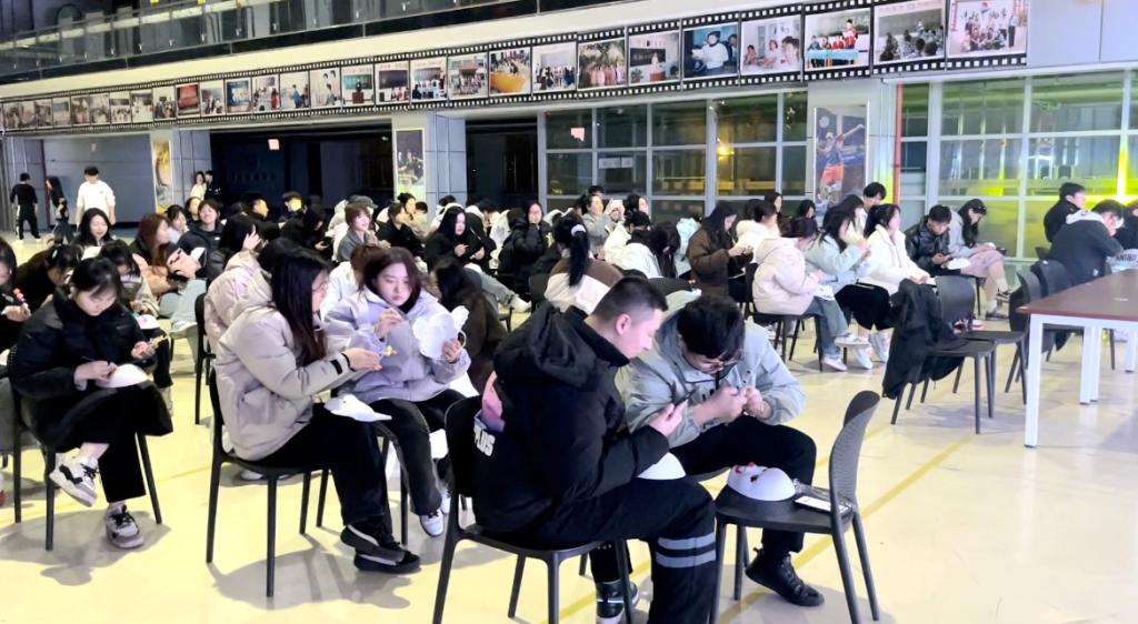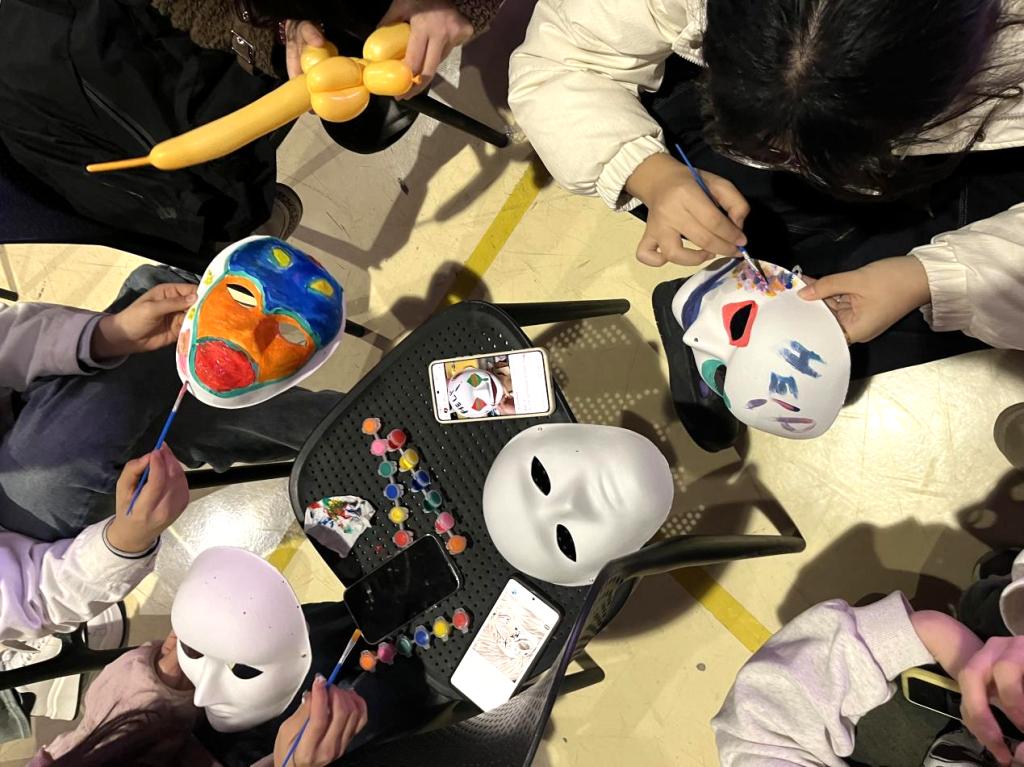 随后,其他同学也纷纷积极主动登上舞台为大家演唱喜爱的歌曲,台下的观众在绘制面具的同时,也为台上表演的学生加油鼓掌。