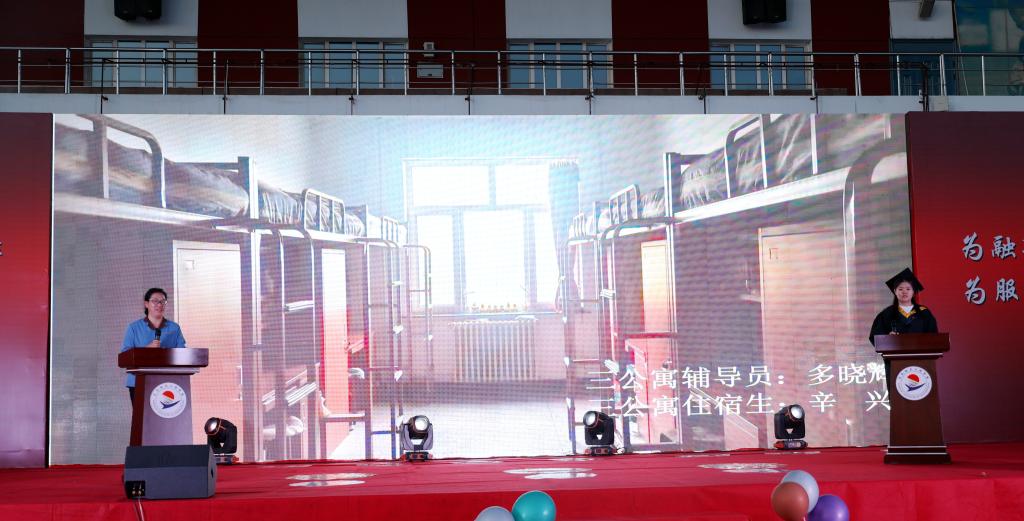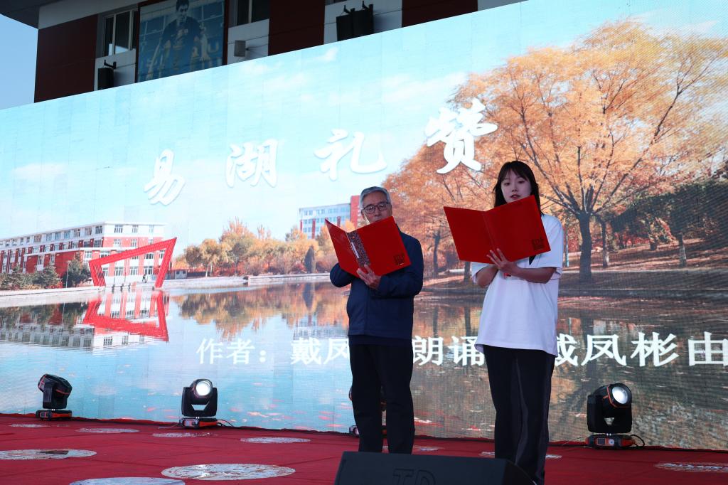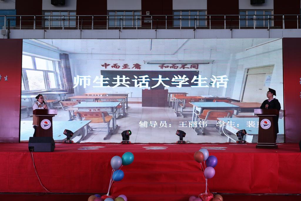 在祝福篇章中,师生代表朗诵《易湖礼赞》,以易湖为视角,回顾学校创业31年历程,阐述学校办学理念,表达毕业生对母校的依依不舍之情。辅导员王丽伟老师和英语181班毕业生裴爽的暖心对话让人难以忘怀,公寓辅导员多晓辉老师与计科181毕业生辛兴的临别对话令全场潸然泪下。