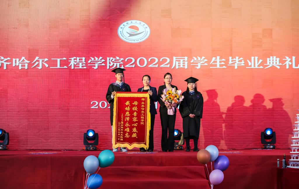 2022届毕业生代表向学校赠送锦旗和鲜花,工会主席、总会计师姜岩与副院长白雪代表学校与毕业生代表合影留念。