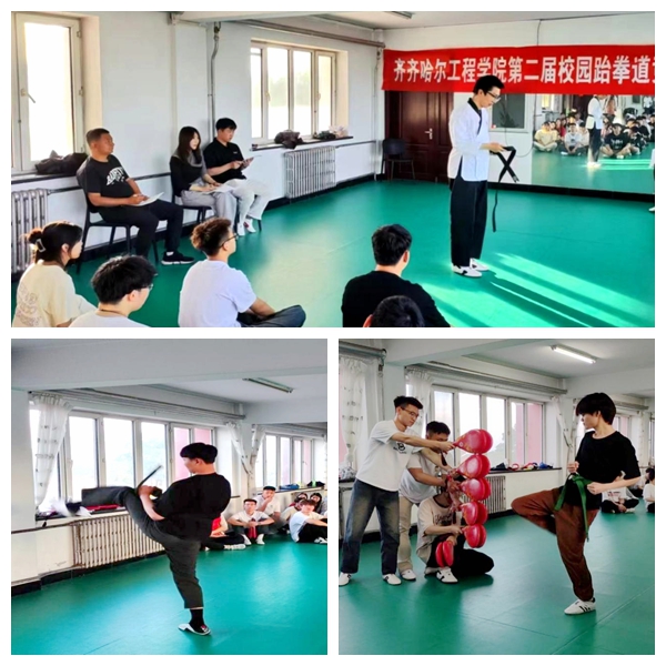 为丰富学生校园生活,增强学生身体素质,5月21日,由学校仁武跆拳道社团组织的第二届校园跆拳道竞赛在体育场跆拳道活动室举行,体育教研室教师孙彦江、董鑫超、徐盼担任裁判,来自不同专业的47名优秀选手齐聚一堂,凭着精湛的技术一决高下。社团负责人杨智维持现场秩序。