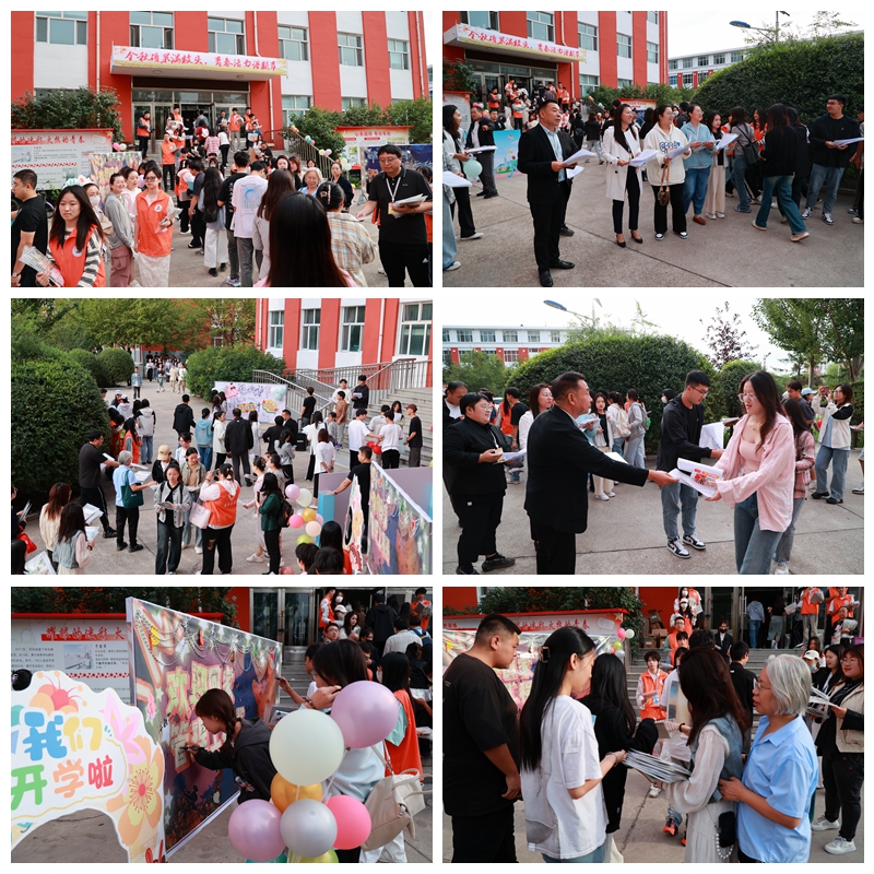 二号教学区门前,也是一片热闹非凡的景象。建筑工程系、管理工程系的领导、辅导员、生涯导师以及学生干部,精心布置欢迎展板、横幅等,向学生们传递了新学期的寄语与期望。