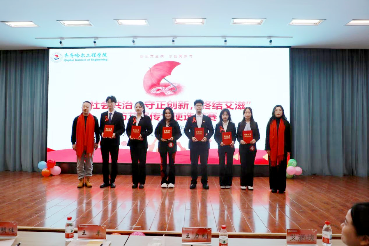 12月1日,在第38个“世界艾滋病日”来临之际,学校团委为普及艾滋病预防知识、增强青年学生自我保护意识,在二号教学区2508会议室举办第二届防艾宣传大使选拔赛。本次比赛以“社会共治,守正创新,终结艾滋”为主题,特邀齐齐哈尔市疾病预防控制中心艾滋病性病防治科王卓、龙沙区疾病预防控制中心党委副书记张明佳、艾滋病性病防治科科长王力刚、校团委指导教师张云惠、大学生心理发展协会指导教师艾涵塽及各二级学院团委书记共同担任决赛评委。
