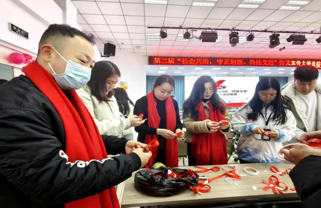 比赛开始,大学生心理发展协会的干部为学生发放材料,指导大家制作“红丝带”。王力刚讲述“红丝带”所代表的意义,让学生更深入地了解预防艾滋病的目的与意义。
