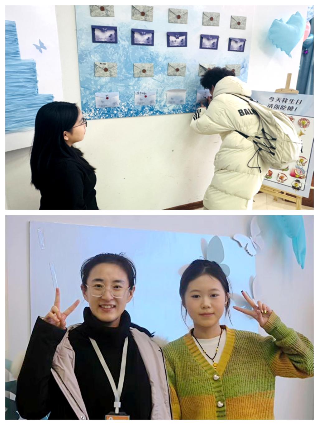 活动伊始,过生日的同学在入口处的主题信封上签名并领取信纸,同学们在打卡区获得定制棒棒糖,并执笔写下心愿,或寄予学业展望,或表达对校园生活的美好祝福。