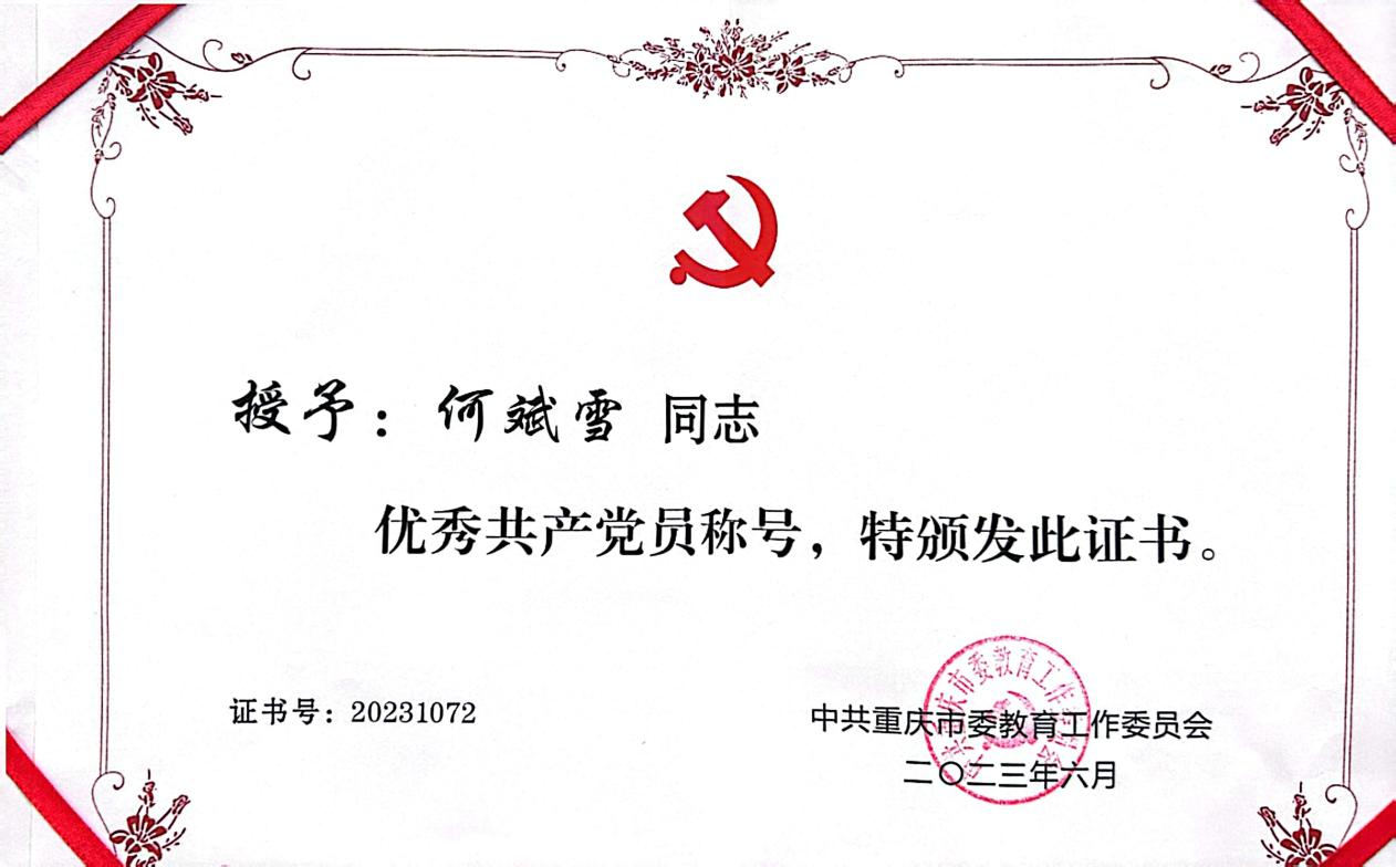在重庆应用技术职业学院,何斌雪怀着对党的忠诚、对职业教育的热爱,刻苦钻研业务,从一名普通教师成长为职业教育领域的优秀人才,在平凡的岗位上创造了可喜的业绩,曾指导学生获得重庆市市级职业技能竞赛一等奖1次、二等奖3、三等奖1次,国家行业级职业技能竞赛三等奖2次;先后获得2021年度优秀共产党员、2021-2023年度优秀教师、2021年重庆市职业技能竞赛优秀指导教师、2023年中共重庆市委教育工作委员会优秀共产党员称号。