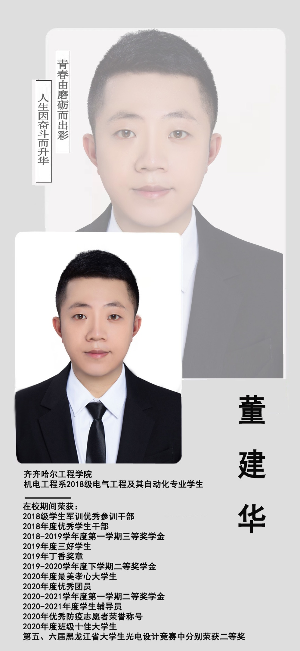 2021年,他在第五届黑龙江省大学生光电设计竞赛上荣获二等奖;2022年,他在第六届黑龙江省大学生光电设计竞赛上荣获二等奖。他深知,学校意在通过“以赛促学、以赛促教”,实现课赛融合的教育模式培养全面发展的高素质人才,这也是董建华一直以来的目标,他相信,敢于尝试,才能无悔青春时光。