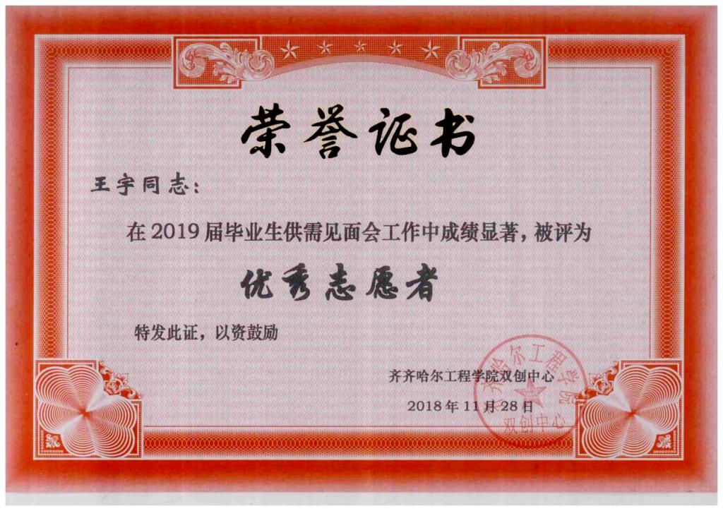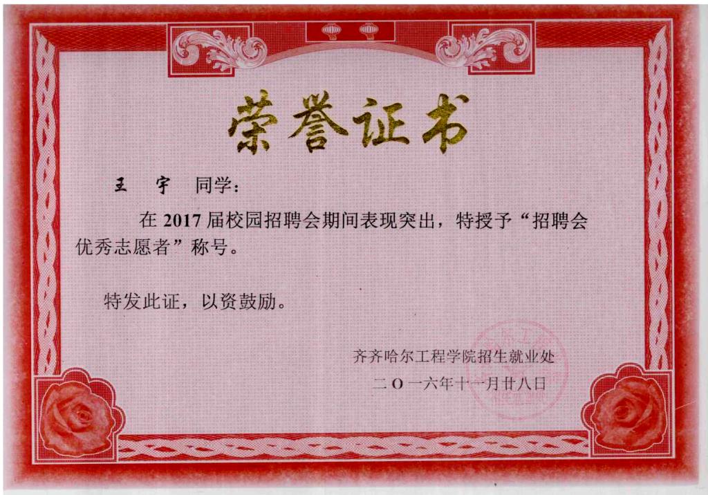 学习之余,王宇积极参与社团活动、发展业余爱好。在校期间,他曾担任校级社团负责人,多次协助学校组织开展新生拓展训练、校园招聘会、社会志愿服务等活动。