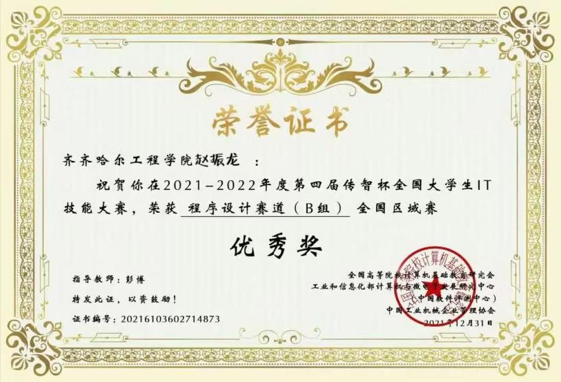 在校期间他积极参与各类校园活动,展现出卓越的组织能力和团队协作精神,曾荣获“优秀学生干部”“优秀团员”等荣誉称号,竞赛方面曾荣获第十三届蓝桥杯全国软件和信息技术专业人才大赛黑龙江赛区C/C++程序设计大赛B组三等奖、第四届传智杯全国大学生IT技能大赛全国区域赛优秀奖。
