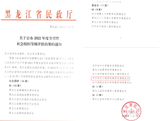 近日,黑龙江省民政厅发布了《黑龙江省民政厅关于开展2022年度全省性社会组织等级评估工作的通知》,我校教育发展基金会获得社会组织(基金会)评估最高等级“5A”。
