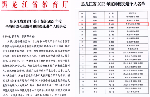 近日,2023年黑龙江省教育系统师德先进集体和先进个人评选结果公布:我校健康与护理系单大海同志获评“师德先进个人”荣誉称号。为深入贯彻落实党的二十大精神和习近平总书记关于教育的重要论述,我校大力加强师德师风建设,积极引导全体教师恪守职业道德,努力培养造就一支师德高尚、业务精湛、结构合理、充满活力的高素质专业化教师队伍,并深入推进师德师风培训、树立师德先进和教书育人典型,营造尊师重教的浓厚氛围,注重...