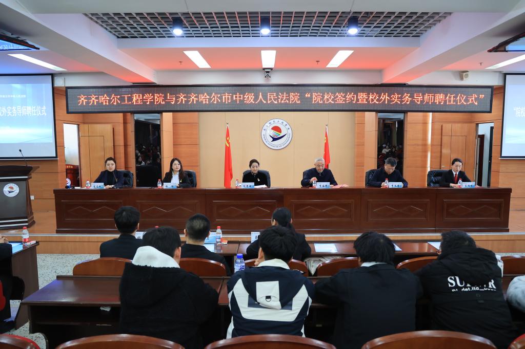 3月20日,学校与齐齐哈尔市中级人民法院“院校合作”签约暨校外实务导师聘任仪式在图书馆601报告厅举行。市法院党组副书记、副院长李国军,市法院党组成员、政治部主任李文孝,学校党委副书记、副院长陈景鑫,副院长张静出席签约仪式,相关部门负责人及人员参加。陈景鑫首先向一直以来关心支持学校发展的市法院各位领导表示感谢。简要介绍了学校在人才培养、办学模式、产业学院等方面取得的成果。她指出,聘任校外实务导师是...
