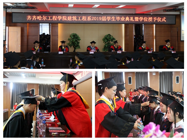 盛夏时节,风光无限。7月3日上午,建筑工程系在学院图书馆601报告厅举行2019届学生毕业典礼暨学位授予仪式。院长助理、建筑工程系主任魏春石,系党总支书记、学生工作副主任王丽萍,教学工作副主任曲梦露及土木工程专...