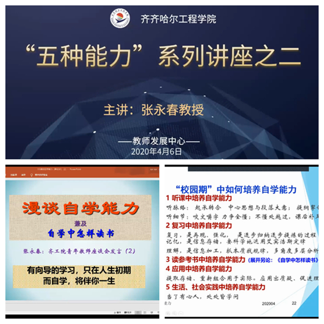 4月6日下午,张永春教授“五种能力”系列讲座之漫谈自学能力讲座以在线方式进行,学校近400位教职工参加学习,副院长张振笋主持活动。 有向导的学习,只在人生初期,而自学,将伴随我们的一生。张永春教授强调自学能...