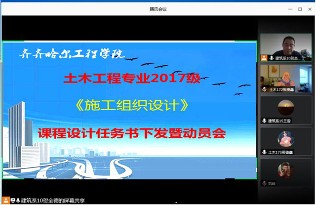 7月6日上午,土木工程专业由任课教师贺全德主持,在线召开《施工组织课程设计》课程实践教学任务下达暨动员会,课程组教师赵玖香、钟美慧、王雪与全体2017级学生参加会议。这次的《施工组织课程设计》实践教学,引入...