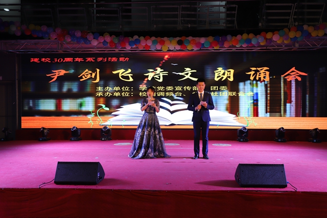 11月10日18点,由学校党委宣传部与团委主办,校园调频台、大学生社团联合会承办协办的庆祝建校30周年系列活动之一“尹剑飞诗文朗诵会”在学生活动中心隆重举行。 学校副院长张振笋、党委宣传部副部长郭伟伟,团委负责...