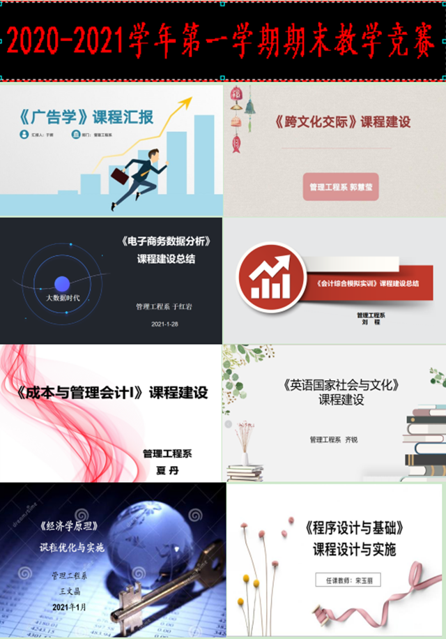 “编筐编篓,重在收口;描龙画凤,难在点睛”。管理工程系于1月25日-29日召开“2020期末总结教学竞赛”,线上线下同时进行,陈景鑫主任、李文禹副主任、刘玉洁老师等担任竞赛评委。竞赛成绩评定,分为说课课件汇报和...