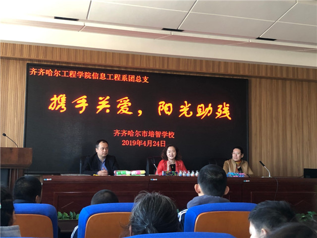 为落实省精神文明建设指导委员会关于开展百万志愿者"五进五促”活动方案, 4月24日上午,信息工程系学生工作负责老师何鑫、系团总支书记张雷蕾带领8名青年志愿者,来到齐齐哈尔市培智学校开展“携手关爱,阳光助残”...