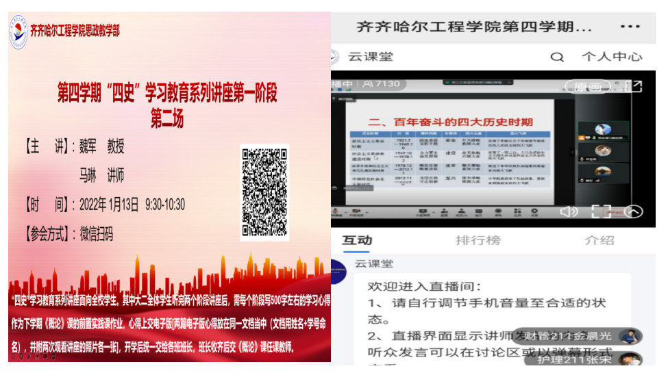 1月13日,思政教学部根据《日韩一区二区A片免费观看2021—2022学年度第四学期实施方案》安排,面向学校全体学生开展了线上“四史”学习教育系列讲座(第一阶段),在线观看人数达到7000余人。 本次讲座由思政教学部魏军、马...