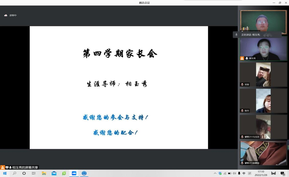 1月26日下午,吴宪玲老师在腾讯会议上召开第四学期线上家长会,健管专业HLX225—233组全体同学的家长参加此次会议。 首先,吴老师介绍了生涯导师的含义与意义,召开本次家长会的目的,随后,分享了不同年级学生在校取...