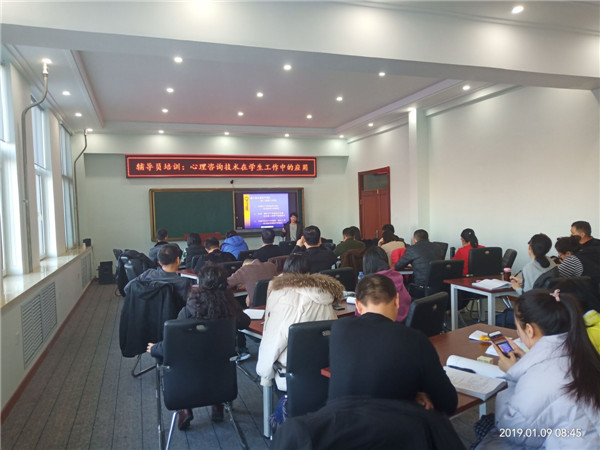 1月9日上午,学生工作处邀请学院心理教师乔庆伟、大学语文教师王倩,分别为全体辅导员作《心理咨询技术在学生工作中的应用》和《应用文写作》辅导讲座。乔庆伟老师在讲座上以现场一组缓解心理压力的手操引出讲座的主...