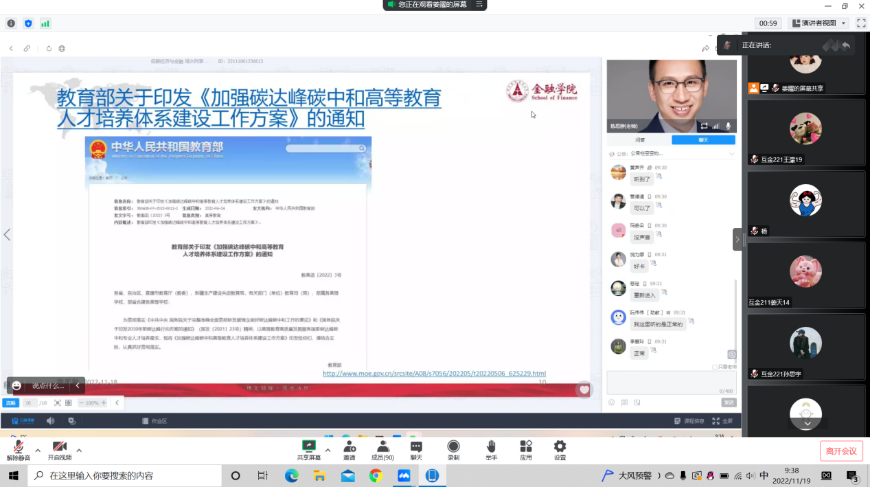11月19日上午,管理工程系互联网金融专业在线举办第九期易湖金融科技论坛。主讲人为中南财经政法大学金融学院博士生导师陈思翀教授,该专业全体学生参加,专业教师沈斯文主持。 陈教授在论坛上作题为《低碳经济与金...