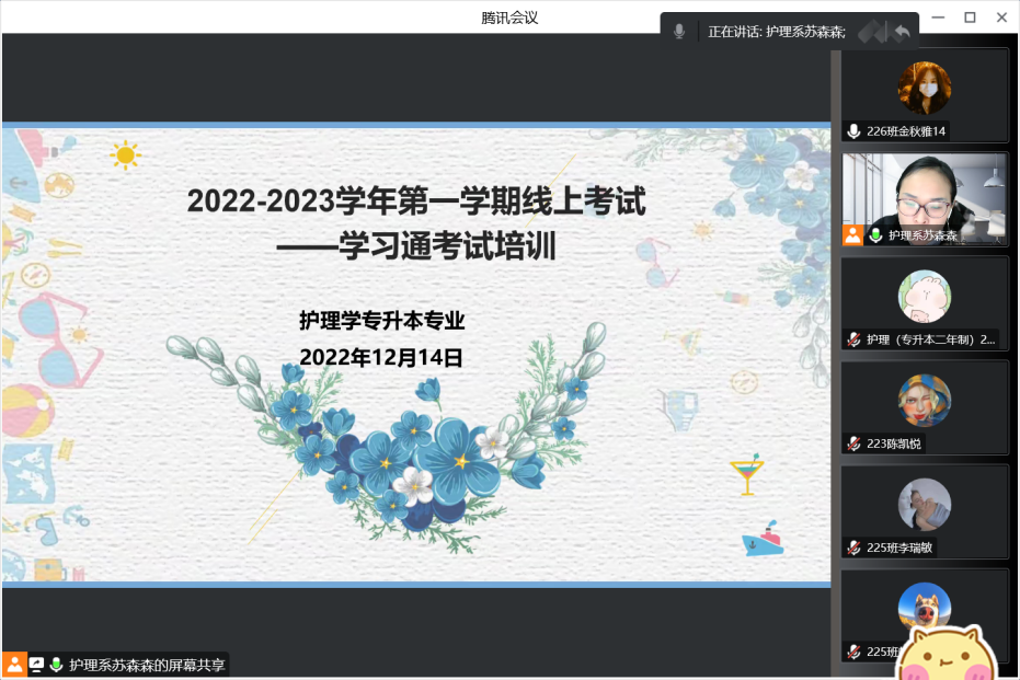 为保证2022-2023学年第一学期期末考试(线上)顺利进行,帮助学生熟练使用(学习通)在线考试的相关功能,近日,健康与护理系护理学专升本专业在线开展学习通考试培训。护理学专升本全体学生参加,苏森森老师主持。 ...