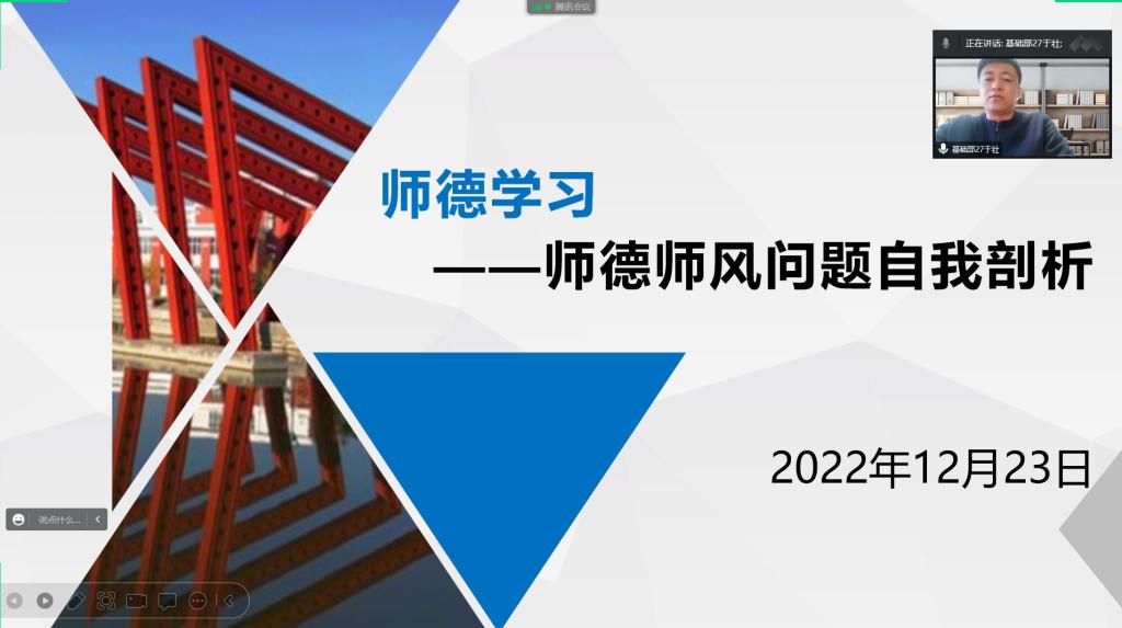 12月23日下午,基础部组织全体教师在线开展师德师风问题自我剖析活动。体育教研室于壮老师主持。 于老师通过对照《新时代高校教师职业行为十项准则》内容,从理论学习依法执教、爱岗敬业奉献精神、倾听交流和谐发展...