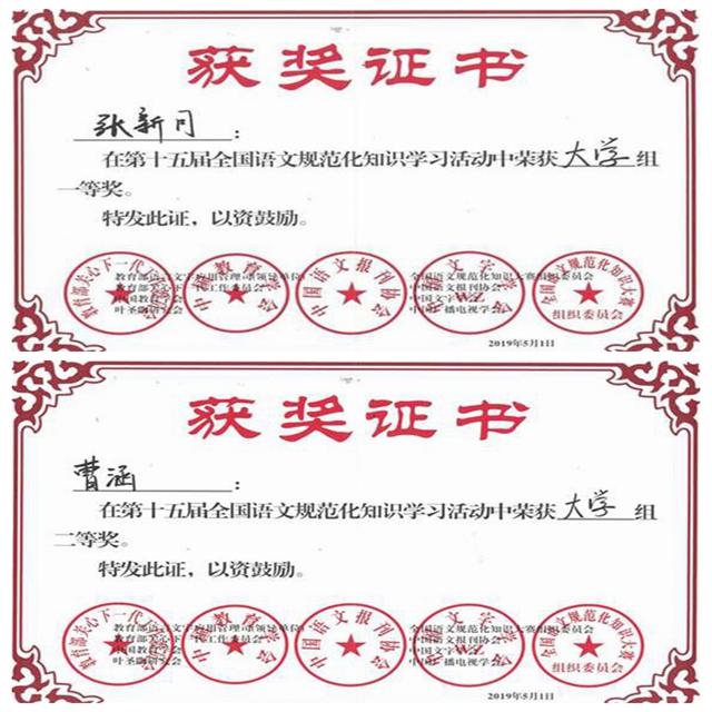 由中国语文报刊协会于今年3月主办的第十五届全国语文规范化知识学习活动结果近日揭晓,学院电商171班曹涵、护理174班张新月同学分获一等奖、二等奖。学院已连续9年组织学生参加此项活动,今年有300余名学生参加。 【...