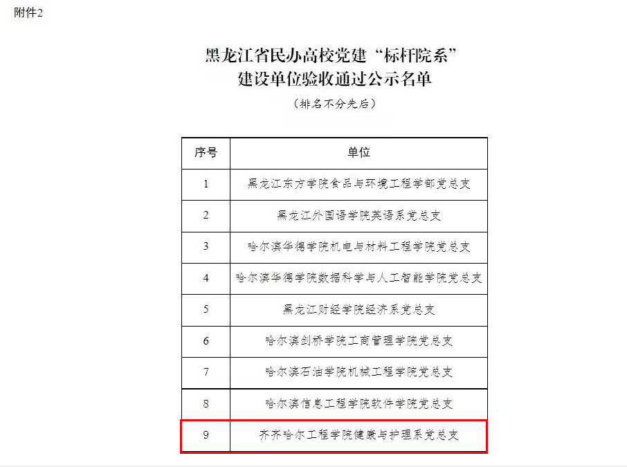 近日,中共黑龙江省委教育工作委员会公布了黑龙江省民办高校党建“标杆院系”建设单位验收结果,我校健康与护理系党总支顺利通过验收。 经创建单位对标自查总结、高校党委组织师生满意度测评、中共黑龙江省委教育工作...