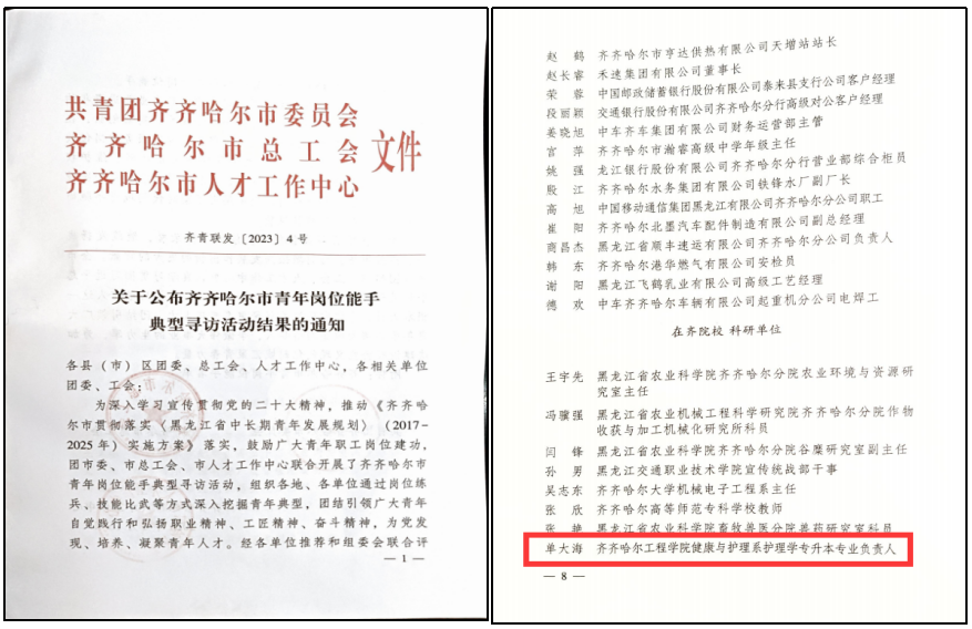 7月18日上午,健康与护理系护理学(专升本)专业负责人单大海收到由齐齐哈尔市总工会、齐齐哈尔市人才工作中心、共青团齐齐哈尔市委员会联合颁发的“齐齐哈尔市青年岗位能手”荣誉证书。 岗位能手重在挖掘青年典型,...