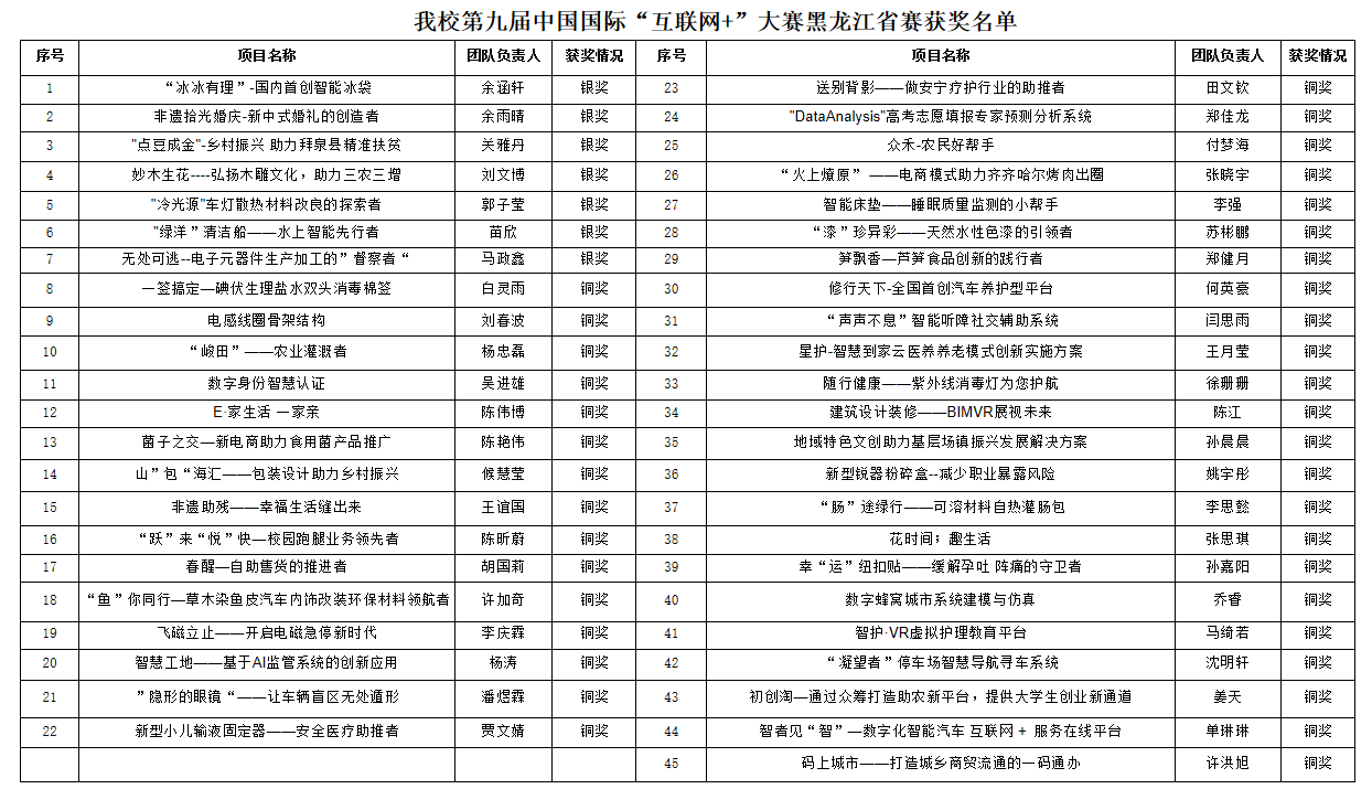 近日,第九届中国国际“互联网+”大学生创新创业大赛黑龙江省决赛在哈尔滨工程大学举行,经过网评、路演等环节的激烈角逐,我校共获得银奖7项,铜奖38项,获得奖项数再创历史新高。 据悉,此次比赛全省共有10万余项...
