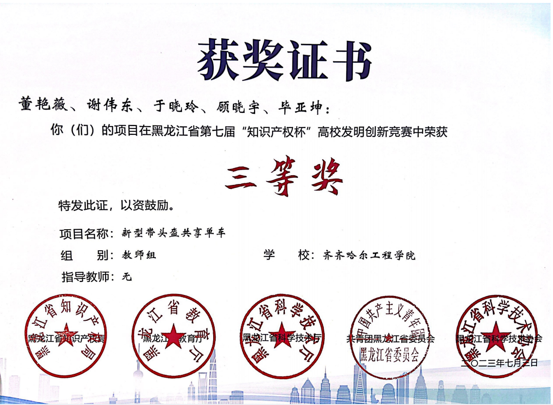 近日,黑龙江省第七届“知识产权杯”高校发明创新竞赛圆满闭幕。我校三支队伍获奖,一支获教师组三等奖,另两支获学生组三等奖。据悉,该竞赛自2011年创办以来每两年举办一次,由省知识产权局、教育厅、科技厅、团省委和省科协共同主办,已成为我省高校师生展现创新才华、迸发创造活力的一项重要赛事。我校由董艳薇老师带队,谢伟东、于晓玲、顾晓字、毕亚坤老师为团队成员创作的作品——“新型带头盔共享单车”获教师组三等奖...
